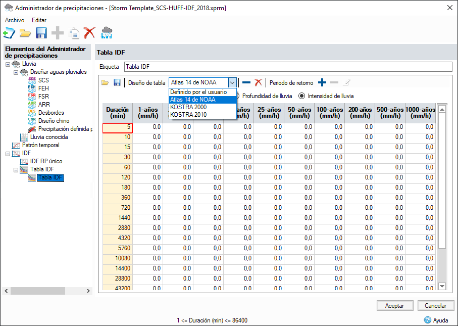 Tabla IDF. Ahora puede configurar varias tablas IDF de períodos de retorno/intervalos de periodicidad promedio en lugar de colecciones de lluvia individuales. Utilice nuestras plantillas autocompletadas para el Atlas 14 de NOAA o datos IDF de KOSTRA 2000 y KOSTRA 2010, o bien cree, guarde y reutilice plantillas personalizadas para su región.