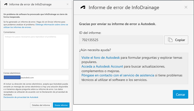 InfoDrainage ha integrado los informes de error de los clientes (CER) de Autodesk, que permiten informar de excepciones que se producen en el software con fines de diagnóstico.