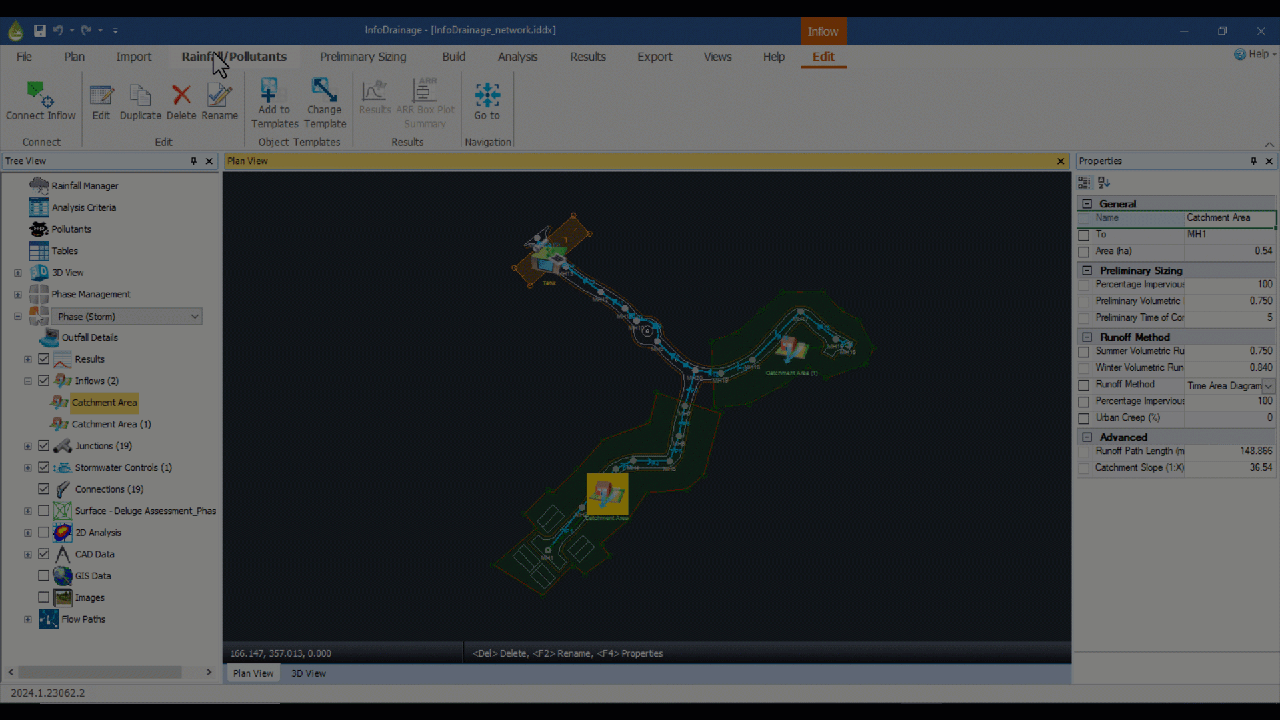 Estos polígonos proporcionan puntos de datos esenciales que informan dinámicamente a los parámetros hidrológicos clave, como el número de curva SCS, el porcentaje impermeable, el coeficiente de escorrentía volumétrica y el grado de urbanización del método Laurenson. Al permitir los cálculos medios compuestos y ponderados, esta funcionalidad permite una representación más detallada del uso mixto de la tierra y las propiedades variadas del suelo en las subcuencas.