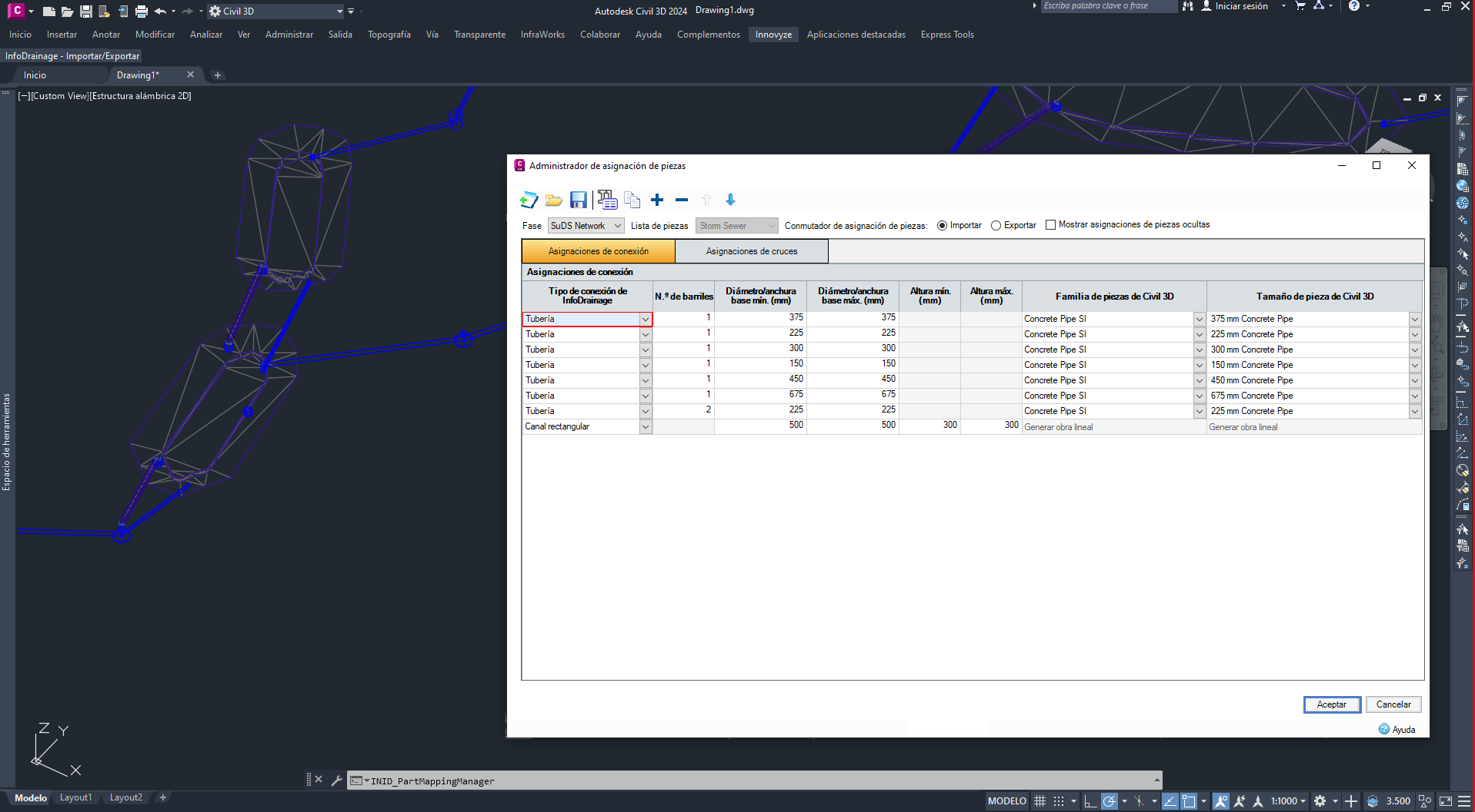 Con la introducción de la especificación de familias de piezas en InfoDrainage, hemos incluido la opción de conservar la familia de piezas de la tubería o la estructura al realizar conversiones bidireccionales con Civil 3D. Anteriormente, la red de drenaje se clasificaba en el proceso de asignación en función del tamaño. Ahora, con las nuevas mejoras, la lógica de asignación clasifica las tuberías y estructuras en función del tamaño y el material. Por ejemplo, si la lógica de asignación detecta dos tuberías de tamaño similar (p. ej., 300 mm) y diferentes materiales (p. ej., hormigón y PEAD), estas dos tuberías se presentarán en la asignación en dos filas diferentes para que pueda asignar una familia de piezas diferente a cada una de ellas.