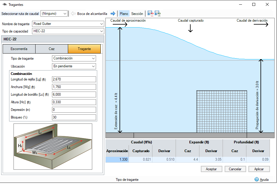 Por lo tanto, hemos ampliado los cálculos de tragantes HEC22 proporcionados por SWMM5 para aumentar su facilidad de uso en el contexto del diseño y ajuste de tamaño. Nuestros cálculos de tragantes HEC-22 mejorados ahora tienen en cuenta el tipo de rejilla y el ángulo de garganta, dos factores críticos que afectan a las velocidades de entrada de agua en el tragante. Al incorporar estos parámetros, nuestro objetivo es ofrecer una representación más realista del funcionamiento de los tragantes de drenaje en diferentes condiciones.