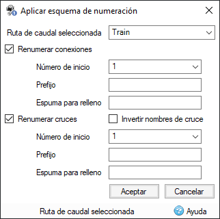 Permite la numeración de conexiones o uniones a lo largo de una ruta de caudal, incluidas las líneas de ramificación entrantes. Se pueden definir el número inicial, el prefijo y el sufijo.