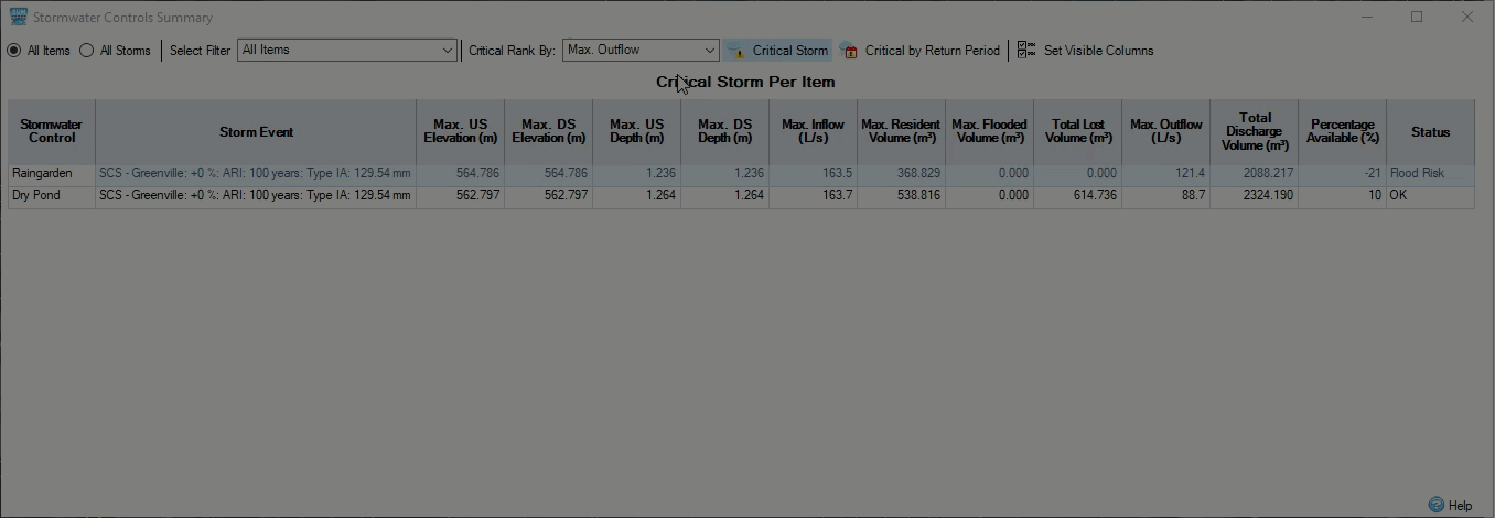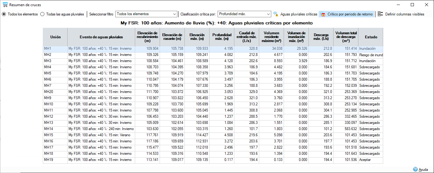 Ahora puede ordenar los resultados con el filtro Crítico por período de retorno para ver la situación más desfavorable de aguas pluviales para cada par de período de retorno y lluvia, por ejemplo, 30 años, 100 años, 100 años más 30 % de cambio climático, etc. Esto permite generar informes fácilmente para cumplir con los requisitos normativos.