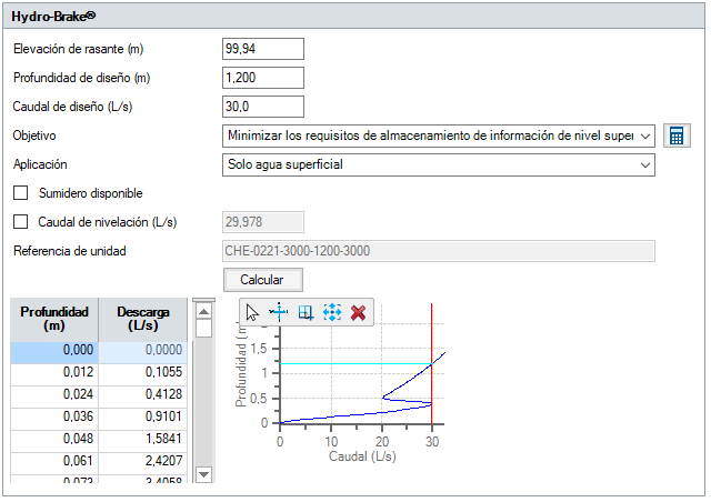 La calculadora integrada, que permite ajustar el tamaño de las salidas Hydro-Brakes® mediante las curvas integradas de Hydro International para sus controles de vórtice, diseña y ajusta automáticamente el tamaño de los dispositivos de control de caudal adecuados con datos de curva integrados sin necesidad de rellenar manualmente las tablas de profundidad o caudal.