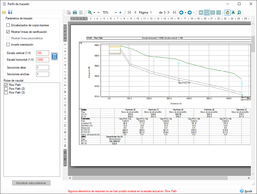 El trazado de la línea piezométrica y la línea de energía proporciona una visión clara y completa de cómo se distribuye la energía, y los cambios que se producen en todo el sistema de drenaje. Esto ayuda a identificar las áreas con posibles problemas, como los cuellos de botella, las secciones del sistema en las que el agua no se drena de manera eficaz o las áreas en las que las velocidades altas pueden provocar erosión o daños en el sistema.
