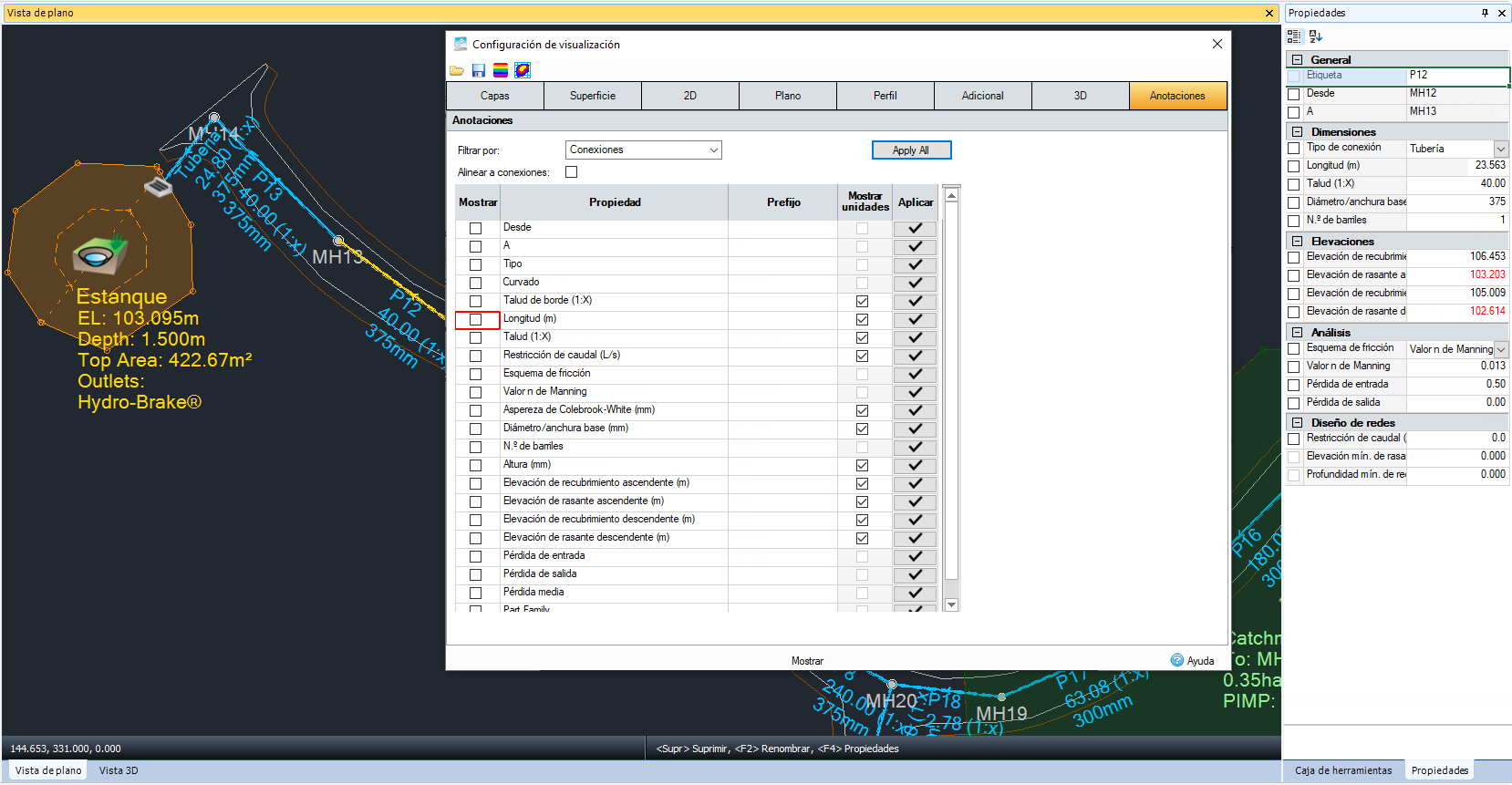 Anote el plan para facilitar la comunicación y reducir el trabajo adicional a la hora de generar dibujos CAD. Esta opción, disponible a través de Propiedades y Configuración de visualización, permite al usuario tener flexibilidad para definir información específica relevante para su proyecto, así como prefijos y unidades según sea necesario para facilitar el envío a las autoridades reguladoras.