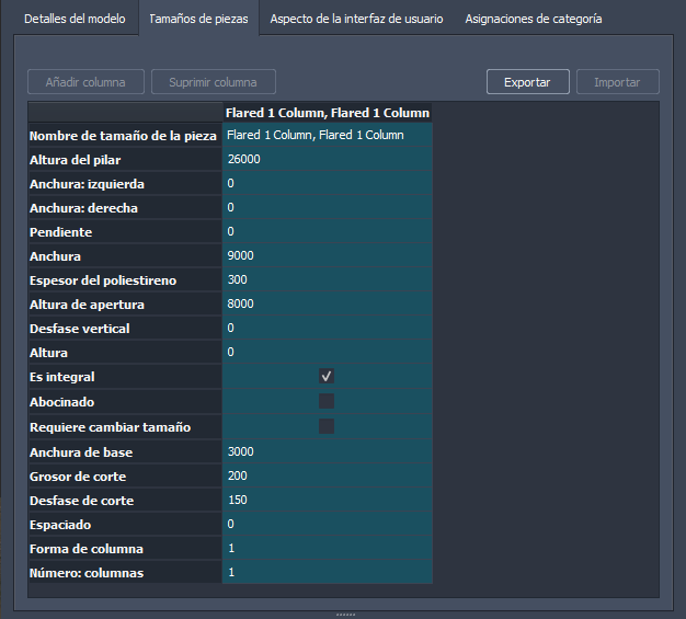 Añadir o suprimir columnas: para crear nuevas variaciones de tamaños de piezas, haga clic en el botón Añadir columna. Cada columna representa un nuevo tamaño de pieza. Haga doble clic en el valor de una fila de la columna de tamaño de pieza seleccionada e introduzca un nuevo valor para modificar ese tamaño. Haga clic en una columna de tamaño de pieza y, a continuación, haga clic en el botón Suprimir columna para eliminarla.