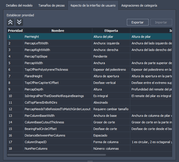 Aspecto de la interfaz de usuario: al añadir o modificar decoraciones de carretera, segmentos de túnel o componentes de puente paramétricos en la ficha Modelos paramétricos de la Paleta de estilos, puede utilizar la ficha Aspecto de la interfaz de usuario del cuadro de diálogo Configurar modelos paramétricos para personalizar cómo se muestran los atributos de componentes paramétricos en la pila.