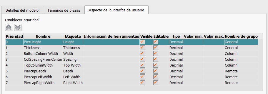Nombre de grupo: haga doble clic en el nombre del grupo e introduzca texto para definir dónde se muestran los atributos de dimensiones clave en la pila. Por lo general, se utilizará el campo Prioridad junto con el campo Nombre de grupo para que pueda organizar en categorías los atributos de la pila a fin de satisfacer las necesidades del proyecto. Por ejemplo, las dimensiones clave de un componente paramétrico Pilar se pueden organizar por categorías como atributos General, Columna y Remate en la pila mediante los campos Nombre de grupo y Prioridad, como se muestra a continuación.