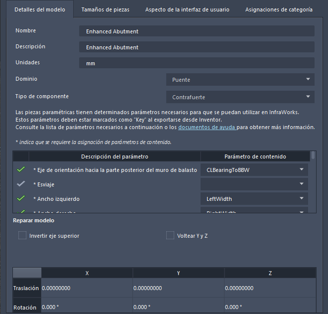 Parámetros necesarios: la ficha Detalles del modelo indica si la pieza paramétrica contiene los parámetros necesarios para este tipo de componente. Una marca de verificación verde confirma que un parámetro necesario está incluido en la plantilla de formas .IPT que define la pieza paramétrica. Se mostrará una X roja junto a cualquier parámetro necesario que no se haya definido en la plantilla de formas para la pieza. No se admiten las piezas paramétricas de puentes y túneles a menos que se hayan definido todos los parámetros necesarios en la plantilla de formas con exactamente la misma convención de nomenclatura que se muestra en la ficha Detalles del modelo.