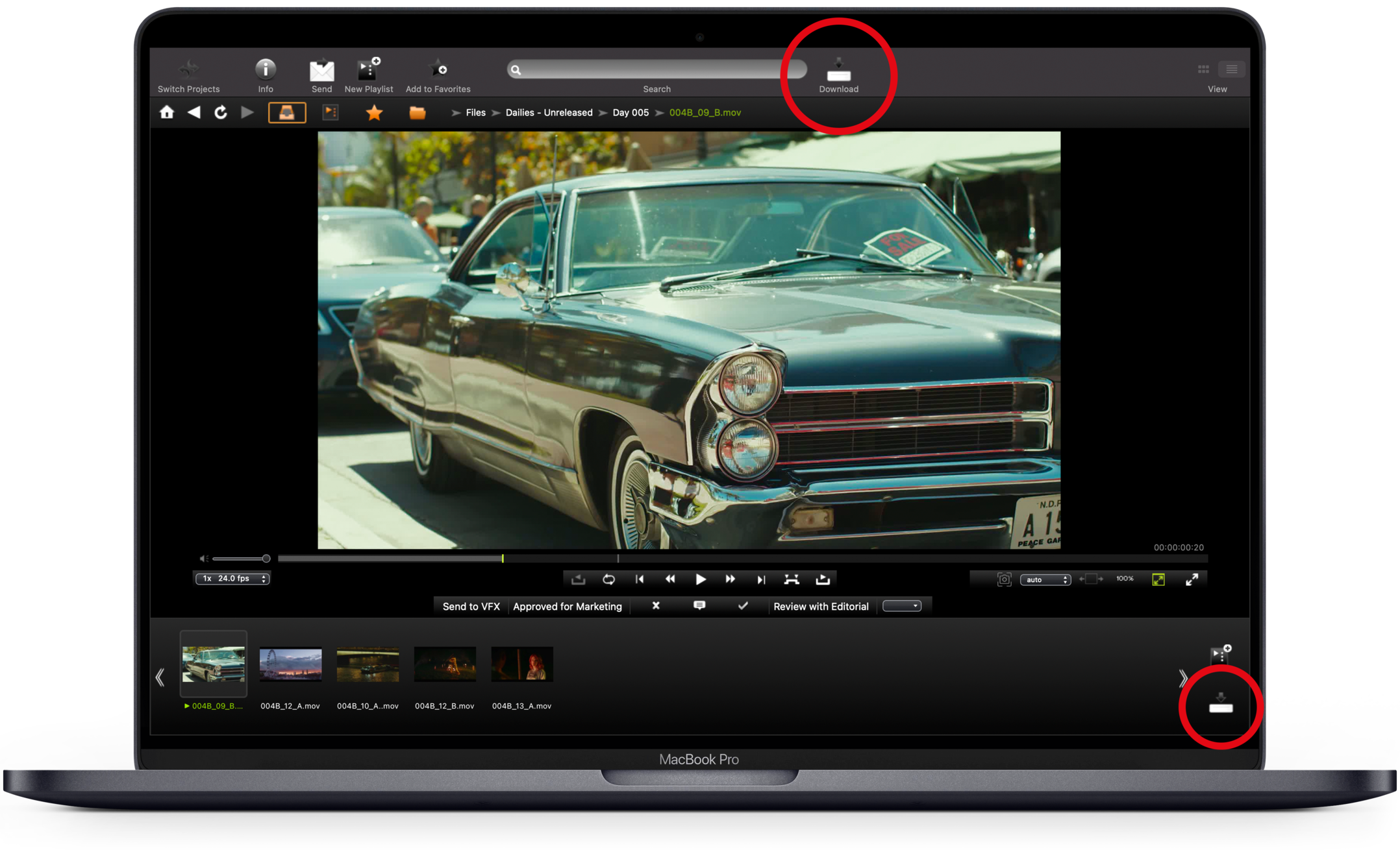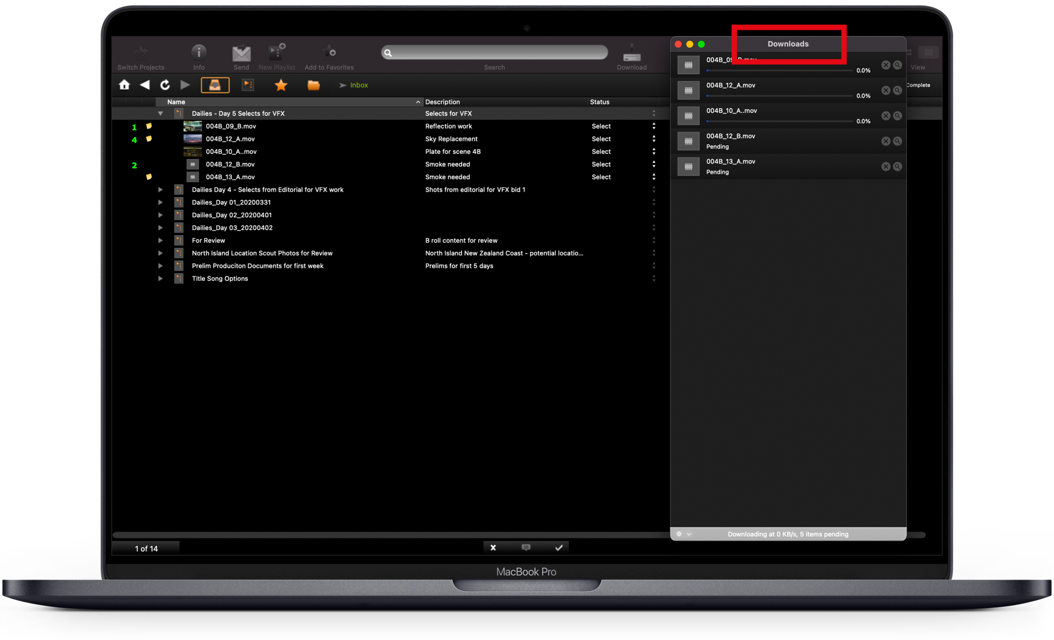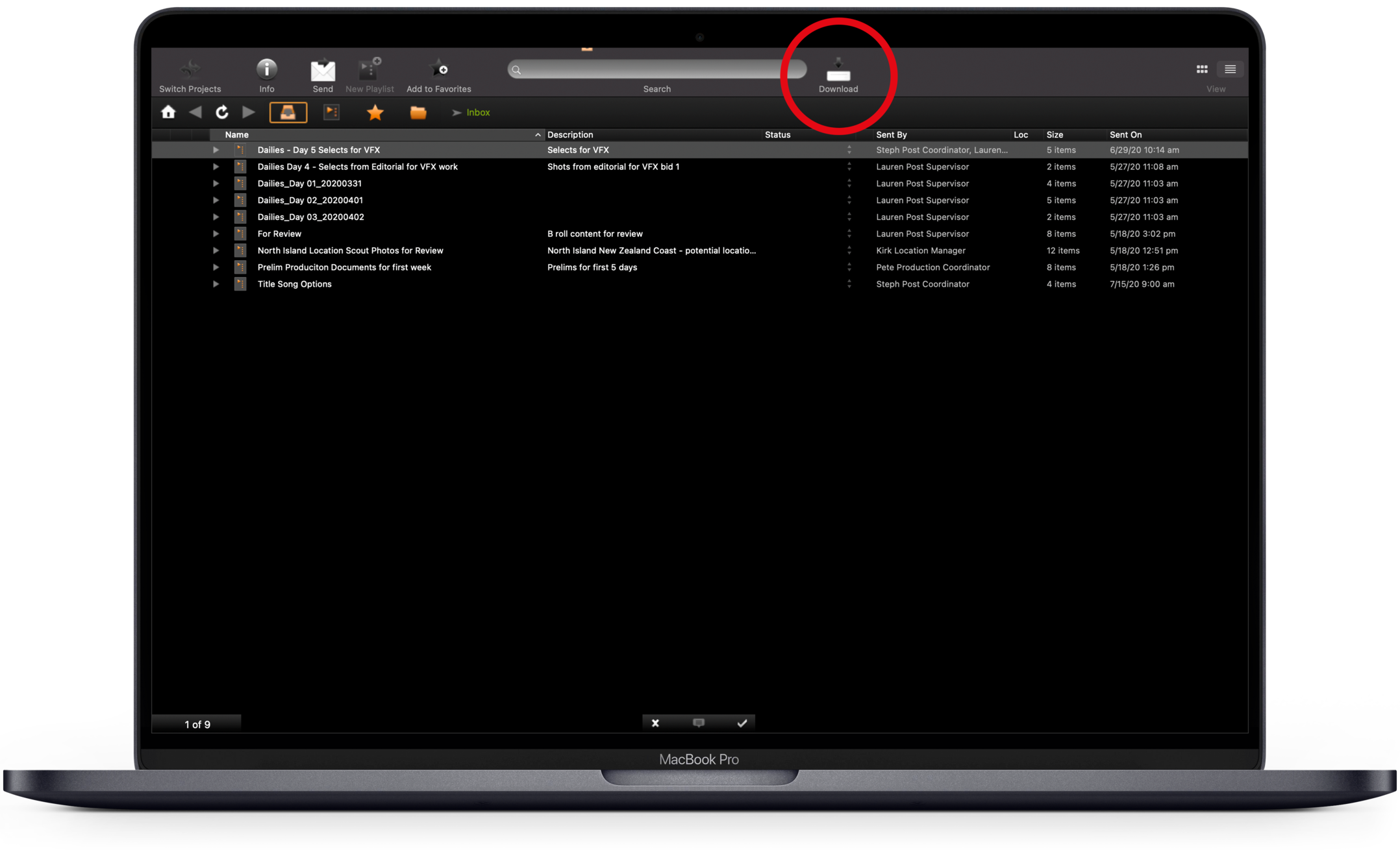 Puede descargar medios desde cualquier lugar del proyecto: la Bandeja de entrada de PIX, la bandeja de entrada, la sección Mis listas de reproducción o la sección Archivos. También puede descargar un archivo mientras lo visualiza en el visor.