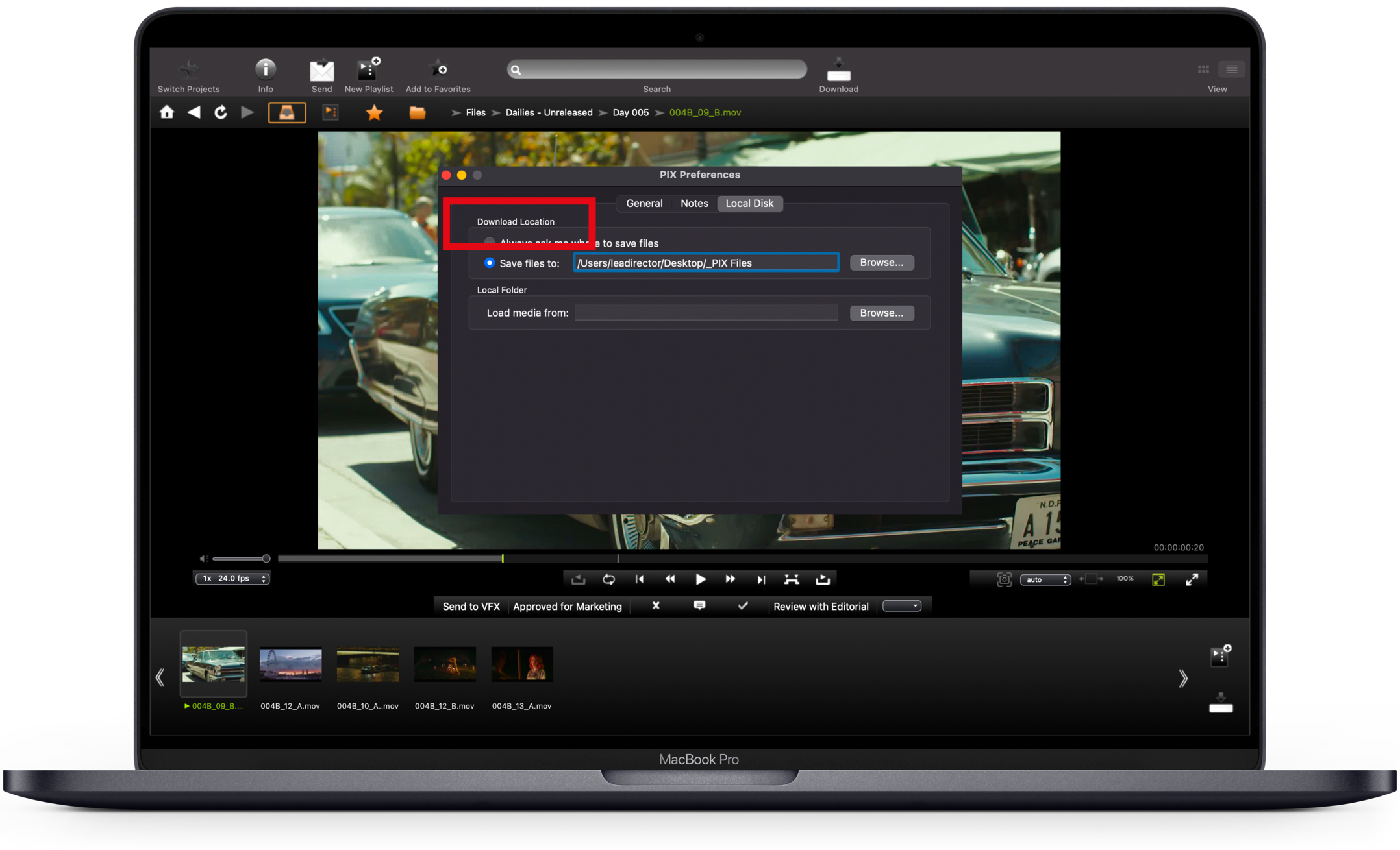 Los usuarios a los que se les haya concedido acceso de descarga a archivos pueden descargar medios en equipos o en su dispositivo iOS. Para obtener más información sobre la descarga en un dispositivo iOS, consulte: Descarga desde PIX para iOS