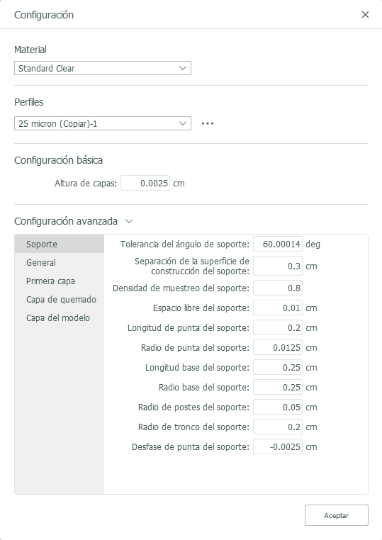 Cada impresora tiene perfiles de impresión predefinidos que contienen ajustes recomendados que se pueden utilizar para acelerar la impresión. Los perfiles de impresión predefinidos se pueden crear para distintas calidades de salida como, por ejemplo, buena, mejor, la mejor. Cuanto más fino es el grosor de la capa, más detallado será el objeto impreso. Los perfiles de impresión predefinidos no se pueden modificar. Si desea un perfil diferente, debe crear uno personalizado.