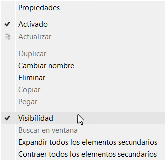 La configuración de visibilidad de un nodo principal anula los de sus elementos secundarios. Por lo tanto, si se anula la selección de Visibilidad para un nodo principal, todos sus elementos secundarios se ocultarán sin tener en cuenta su configuración de visibilidad. Si habilita la visibilidad para un nodo principal, solo se mostrarán los elementos secundarios que tengan la visibilidad habilitada.