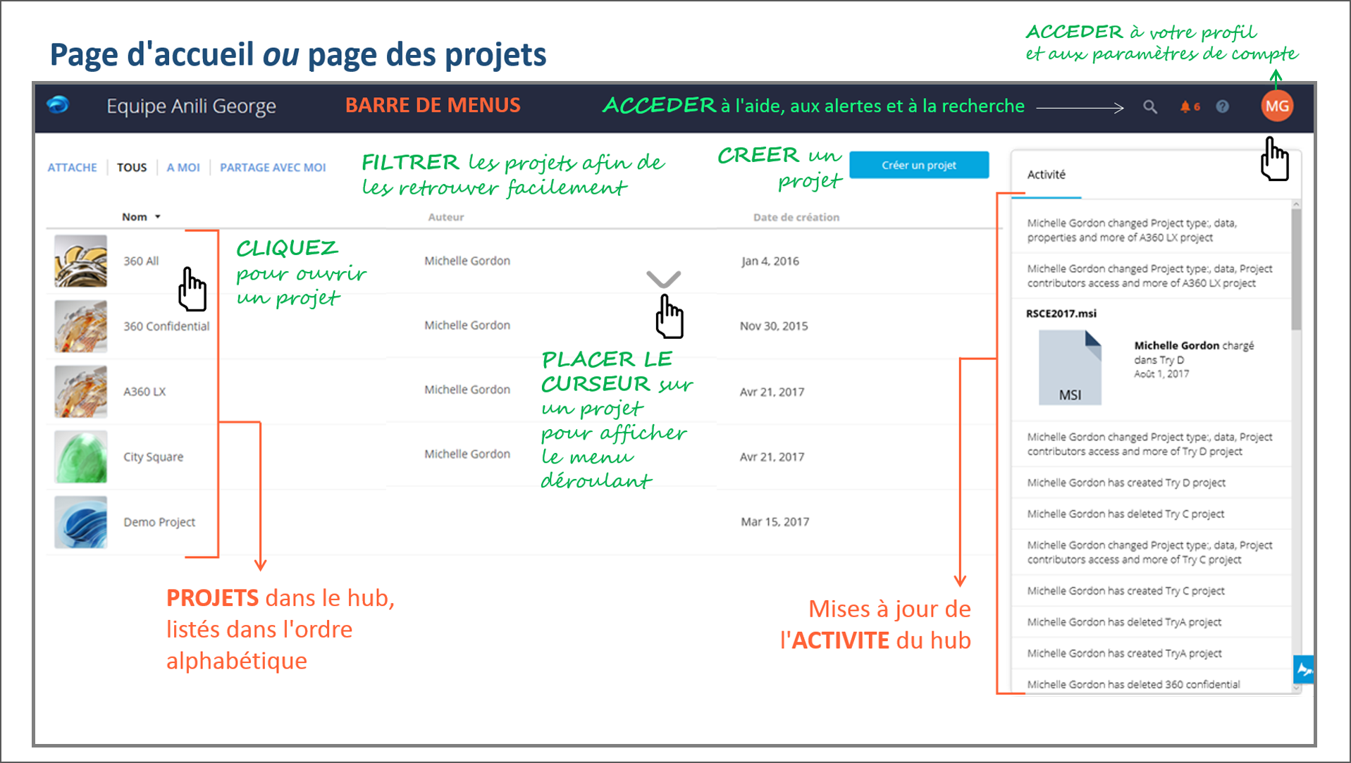 Lorsque vous vous connectez à A360, la page d'accueil du hub ou la page des projets s'ouvre. La présentation ci-dessous vous aidera à vous repérer sur la page des projets. Sur la page des projets, vous pouvez :