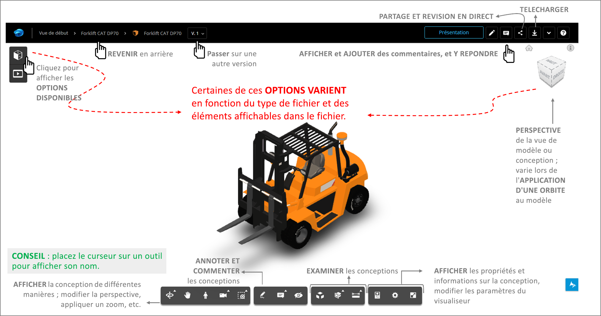 Reportez-vous à l'image ci-dessous du visualiseur A360 et les différents outils et options que vous pouvez utiliser pour afficher et vérifier une conception.