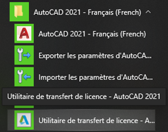 - Windows. Recherchez le raccourci LTU dans le menu Démarrer, dans le même dossier que le produit Autodesk que vous souhaitez transférer.