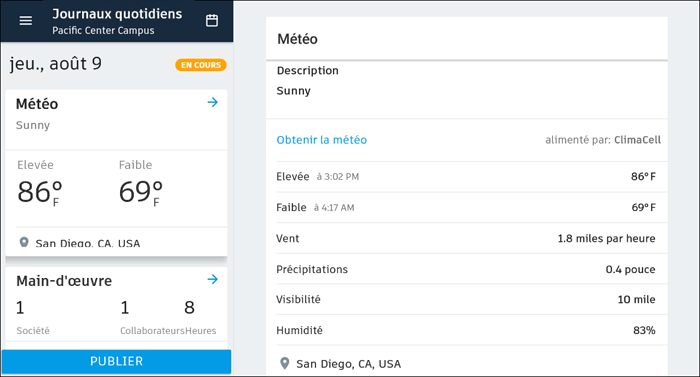 Ajoutez des conditions météorologiques, des indicateurs de mesure de main-d'oeuvre et des notes d'évolution aux journaux quotidiens. Affichez et actualisez les journaux quotidiens en fonction de vos besoins. Pour plus d'informations sur les fonctionnalités Journaux quotidiens avec l'application Android, reportez-vous à la rubrique Référence de fonctionnalités de l'application mobile BIM 360.