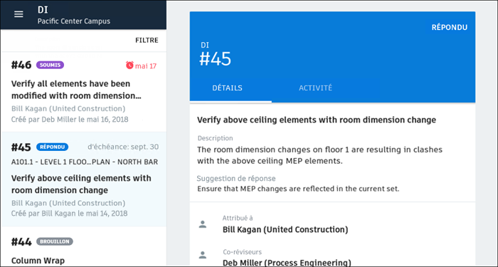 Affichez les DI (demandes d'informations) au niveau du document ou du projet sur des fichiers 2D et des modèles 3D. Pour plus d'informations sur les fonctionnalités DI avec l'application Android, reportez-vous à la rubrique Référence de fonctionnalités de l'application mobile BIM 360.