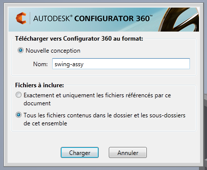 - Chargez la conception de base. Si le chargement est effectué à partir d'Inventor, sélectionnez Tous les fichiers contenus dans le dossier et les sous-dossiers de cet ensemble. Si vous créez votre propre fichier ZIP, assurez-vous d'y inclure le fichier IDW.