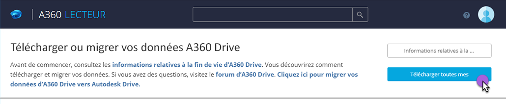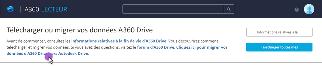 Les fichiers qui ont été chargés dans A360 Drive via les applications Web et mobile d’AutoCAD ne seront pas migrés vers Autodesk Drive. Contactez l’assistance Autodesk si vous rencontrez des problèmes avec ces fichiers.