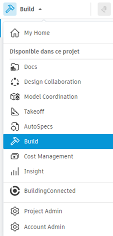 Les abonnés à Build, BIM Collaborate Pro, Docs et Takeoff peuvent utiliser le sélecteur de produits situé en haut à gauche de l’écran pour passer d’un produit à l’autre.