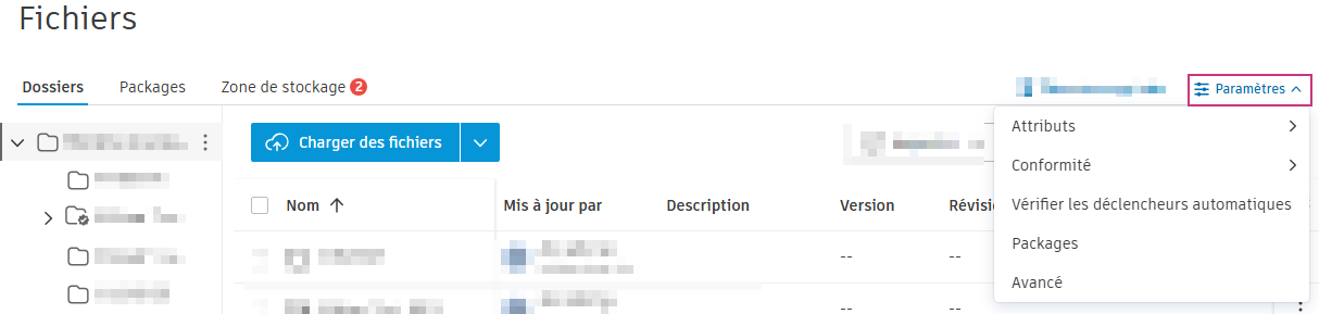 L’outil Fichiers inclut certains paramètres généraux qui s’appliquent à tous les dossiers ou fichiers. Seuls les administrateurs de projet peuvent accéder aux paramètres et les modifier :