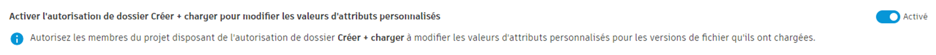 Activez ce paramètre pour permettre aux membres du projet disposant d’une autorisation de dossier de type Créer + Charger de modifier les valeurs d’attribut personnalisé pour les versions de fichier qu’ils ont chargées.