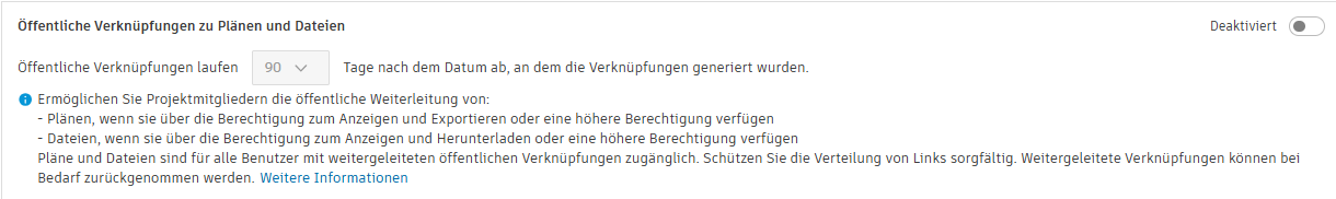 Le paramètre Liens publics vers les plans et les fichiers vous permet d’activer ou de désactiver le partage de liens vers un fichier pour les membres n’appartenant pas au projet. Lorsque cette option est activée, seuls les membres du projet disposant d’au moins des autorisations Afficher + Télécharger peuvent générer un lien publiquement partageable vers un fichier ou un dossier.