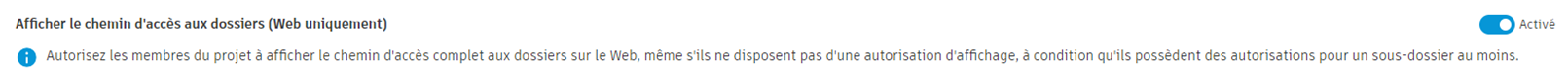Activez le paramètre Afficher le chemin d’accès au dossier (Web uniquement) pour permettre aux membres de voir le chemin d’accès complet au dossier, y compris les dossiers qu’ils n’ont pas le droit de consulter, à condition qu’ils aient l’autorisation d’accéder à au moins un sous-dossier.