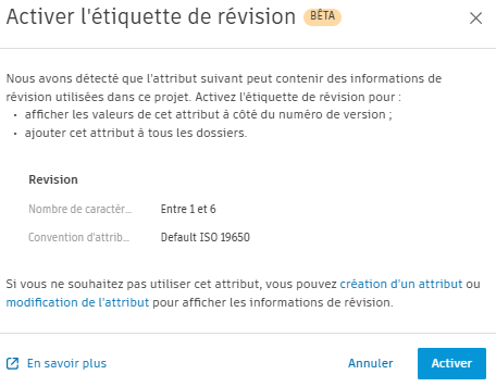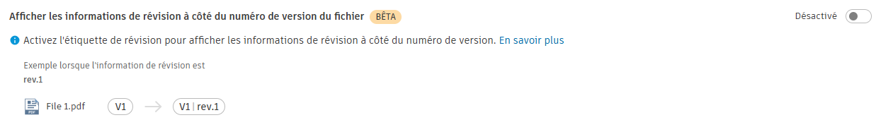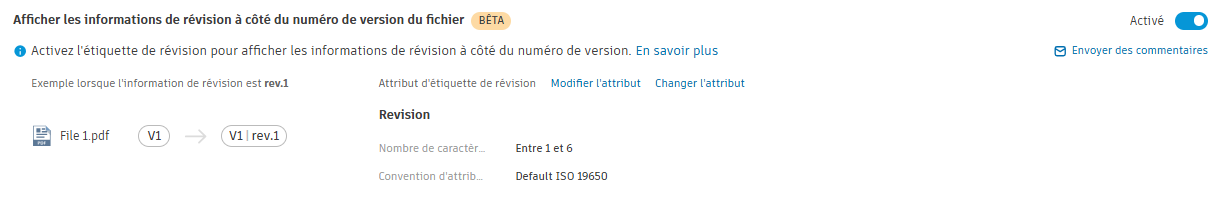 Activez ce paramètre pour accéder au workflow afin d’afficher les informations de révision à partir d’un attribut de champ de texte choisi en regard du numéro de version du fichier.