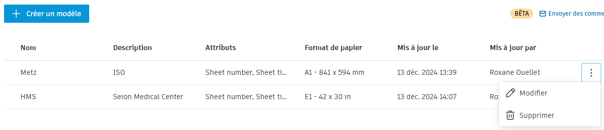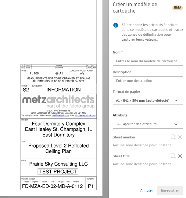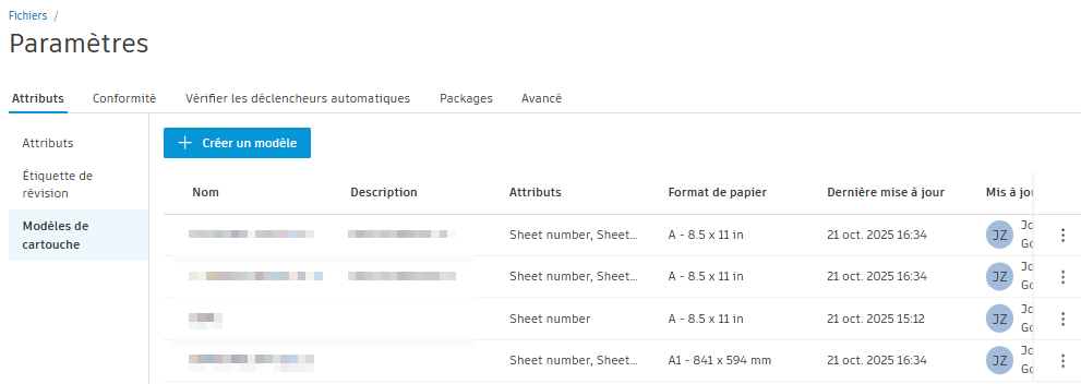Les administrateurs de projets peuvent créer des modèles de cartouche à tout moment. Par exemple, si un projet utilise principalement des dessins avec la même présentation de cartouche et le même format de papier, ils peuvent créer un modèle au début du projet pour faire gagner du temps aux membres.