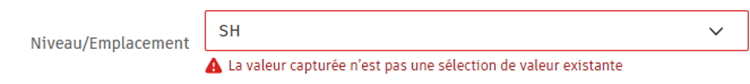 Dans cet exemple, l’attribut personnalisé Niveau/emplacement est une liste déroulante avec des valeurs spécifiques définies lors de sa création. Cependant, la valeur capturée ne correspond à aucune de ces valeurs. Vous pouvez cliquer sur le champ et sélectionner une valeur dans la liste déroulante pour corriger l’erreur.