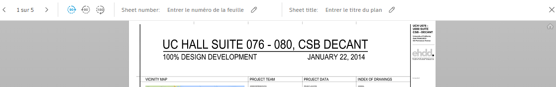Vous pouvez faire pivoter les pages ici et si vous ouvrez une page dans le visualiseur. Cela peut être utile si, par exemple, le cartouche s’affiche verticalement au lieu d’horizontalement, ce qui peut affecter la façon dont vos numéros de plan extraits sont affichés. Vous pouvez faire pivoter les plans pour déclencher à nouveau l’extraction des numéros de plan.