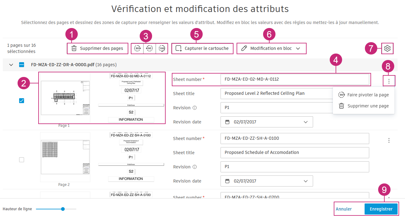 - Saisissez manuellement le numéro de plan. - Supprimez la page si elle ne doit pas être extraite ni enregistrée. |