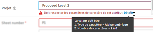 Dans l’exemple suivant, l’attribut personnalisé Projet est un champ de texte avec un type de caractère = alphanumérique et une longueur de caractère = 2 à 6. Bien que la valeur soit correctement alphanumérique, la longueur du caractère dépasse la limite de six caractères et produit donc une erreur qui doit être résolue.