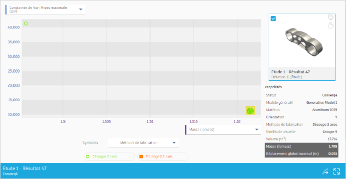 Pour afficher la miniature et les propriétés du résultat sélectionné, accédez au volet Propriétés à droite du diagramme de dispersion. Les options Masse et Contrainte de Von Mises maximale sont mises en surbrillance, car elles s’affichent sur les axes du diagramme de dispersion.