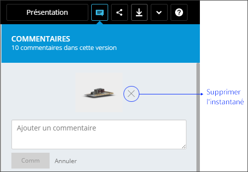 Lorsque vous rédigez un commentaire, un cliché de votre vue de la conception est automatiquement ajouté au commentaire. Vous pouvez ajuster votre vue de la conception avant de publier votre commentaire. Si vous ne souhaitez pas inclure le cliché dans votre commentaire, vous pouvez le supprimer.