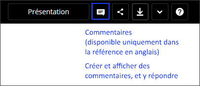 Pour laisser un commentaire général ou poser une question, utilisez la fonctionnalité Commentaires disponible dans la partie supérieure. Si vous voulez qu'une personne en particulier consulte votre commentaire, utilisez la mention @ suivie du nom de la personne.