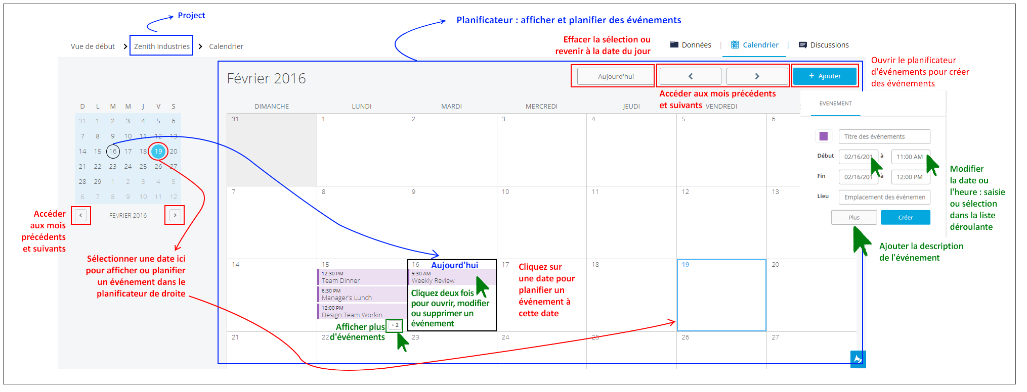 Un calendrier est disponible pour chaque projet afin de planifier des événements propres au projet. Tous les membres du projet peuvent créer, modifier et supprimer des événements.