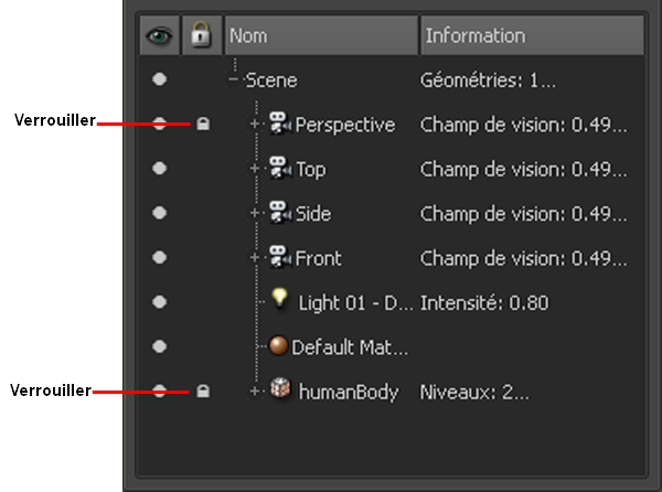 • Sélectionnez le modèle que vous souhaitez verrouiller dans la Liste d'objets, puis cliquez sur l'icône Verrouiller. (Cliquez de nouveau sur l'icône pour déverrouiller l'élément.)