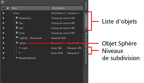 La liste d'objets indique également le nombre de niveaux de la sphère, ainsi que des informations sur ces derniers.
