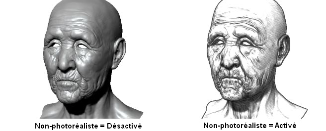 L'effet Non photoréaliste affiche les objets de la scène avec une apparence d'esquisse à main levée. Ce filtre vous permet de présenter vos travaux de sculpture de façon à ce qu'ils semblent plus conceptuels en termes de développement.