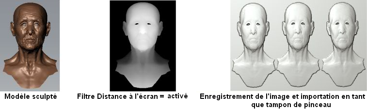 Le filtre Distance à l'écran permet de créer rapidement des pochoirs, des tampons ou des textures de déplacement à partir des objets sculptés de la scène. L'activation du filtre modifie l'affichage de la vue 3D afin que les objets soient ombrés du noir au blanc en fonction de leur distance par rapport au point d'origine de la caméra.