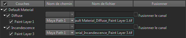 - Lorsque cette option est activée, Mudbox remplace le(s) nom(s) de colonne Nom de fichier dans l'arborescence par le(s) nom(s) de gabarit Nom du canal, Nom du groupe et Nom de couche correspondant(s).