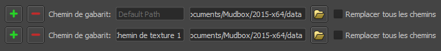 - Indiquez l'emplacement où vous voulez enregistrer les couches de peinture exportées. Par défaut, ce chemin d'accès est défini sur le répertoire par défaut dans lequel sont stockés les fichiers temporaires Mudbox. Reportez-vous également à la rubrique Environnement de fichiers. Cliquez sur l'icône "+" ou "-" respectivement pour ajouter ou supprimer un chemin.