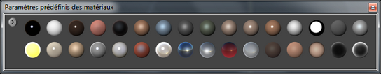 Un certain nombre de matériaux préfabriqués sont disponibles dans le tiroir Paramètres prédéfinis des matériaux. Cliquez sur un élément dans le tiroir pour l'appliquer à votre modèle actif dans la vue 3D. Cela peut être utile si vous n'avez jamais utilisé les matériaux auparavant.