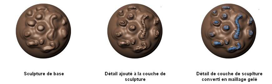 Mudbox attribue une valeur de gel à chaque sommet affecté par la couche de sculpture actuelle. Les niveaux de gel sont déterminés par le déplacement relatif de chaque sommet par rapport au sommet ayant le plus grand déplacement, qui reçoit un maximum de gel.