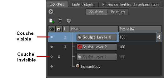 Vous pouvez activer ou désactiver l'affichage d'une couche de sculpture afin d'éviter de modifier par inadvertance cette couche ou pour voir comment s'affiche le modèle sans les objets sculptés.