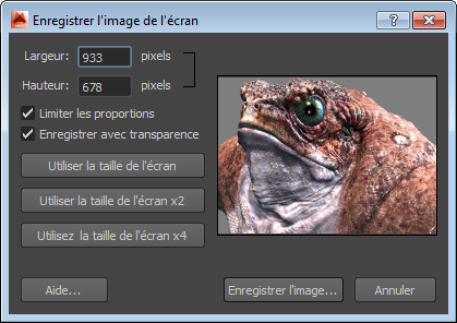 - Pour enregistrer une image dont la résolution est deux ou quatre fois supérieure à celle de la vue 3D, cliquez sur le bouton Utiliser la taille de l'écran x2 ou Utiliser la taille de l'écran x4.
